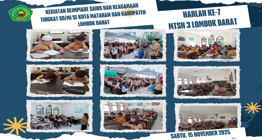Lombok Barat,15 November 2025 – Dalam rangka memperingati Hari Lahir (Harlah) ke-7, MTsN 3 Lombok Barat kembali menorehkan prestasi membanggakan sebagai penyelenggara kegiatan edukatif dan kompetitif bagi siswa-siswi tingkat SD/MI. Tahun ini, madrasah berhasil menyelenggarakan Olimpiade Sains dan Keagamaan dengan peserta yang membludak, yakni diikuti oleh 17 SD/MI se Kota Mataram dan Kabupaten Lombok Barat dengan total 87 peserta, menjadikannya jumlah peserta terbanyak sejak olimpiade ini pertama kali digelar.
